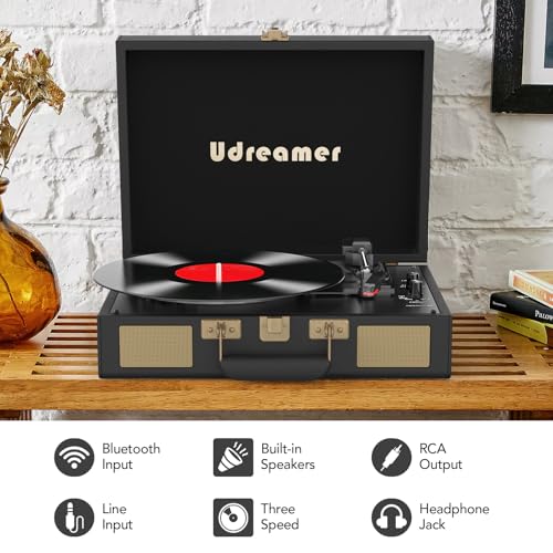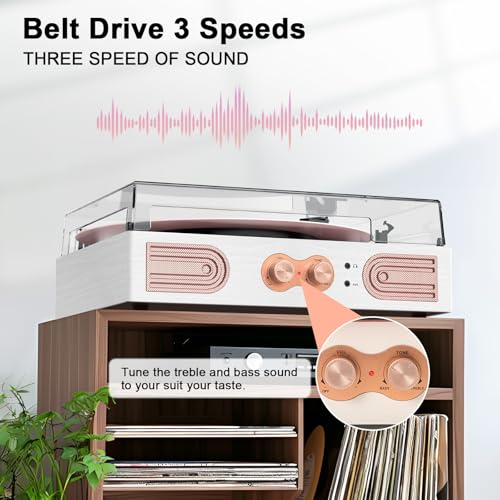 Click for More Images THREE-SPEED BELT-DRIVE TURNTABLE: Plays 33 1/3, 45, and 78 RPM records; Use the cueing lever to lower the needle and fine-tune playback with adjustable pitch controlBLUETOOTH RECORD PLAYER: Bluetooth connectivity lets you...